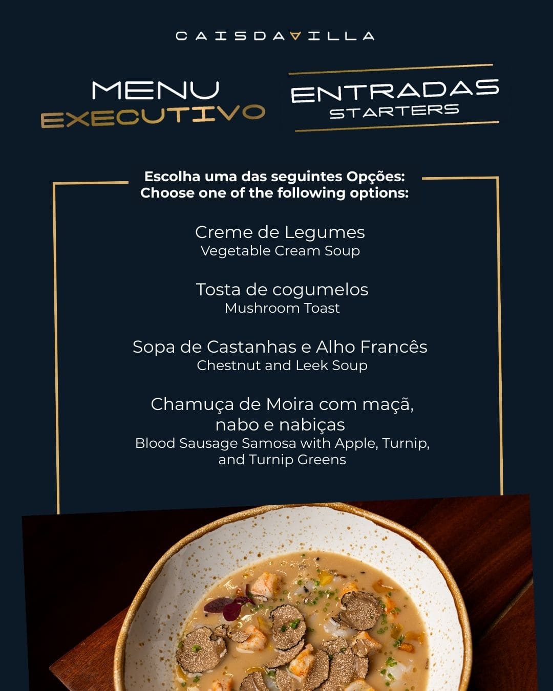 At Cais da Villa, we believe that every meal is an opportunity to celebrate quality, detail and the pleasure of hospitality. The Executive Menu was designed precisely for this purpose: to provide a special moment, even on the busiest of days.