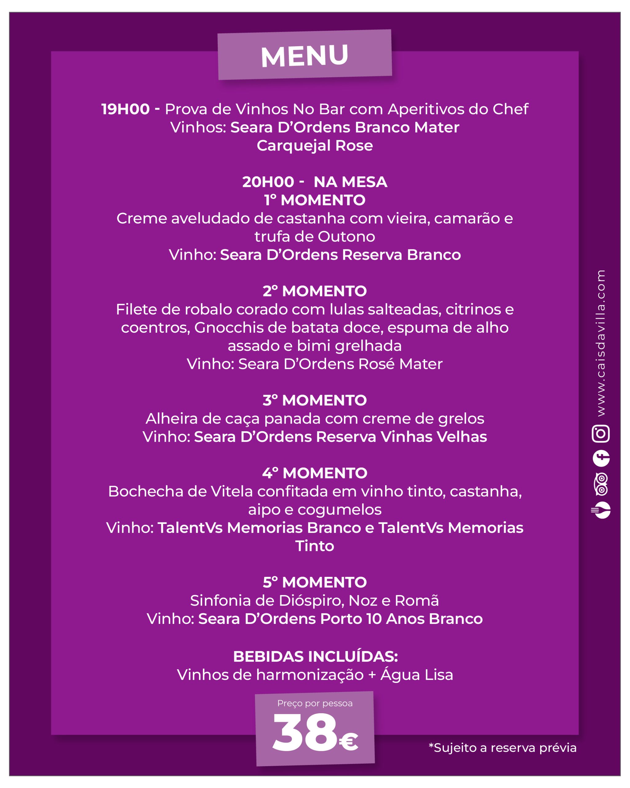 O Cais da Villa convida-o a desfrutar de uma experiência gastronómica inesquecível, numa noite em que o vinho e a gastronomia se encontram em perfeita harmonia.
