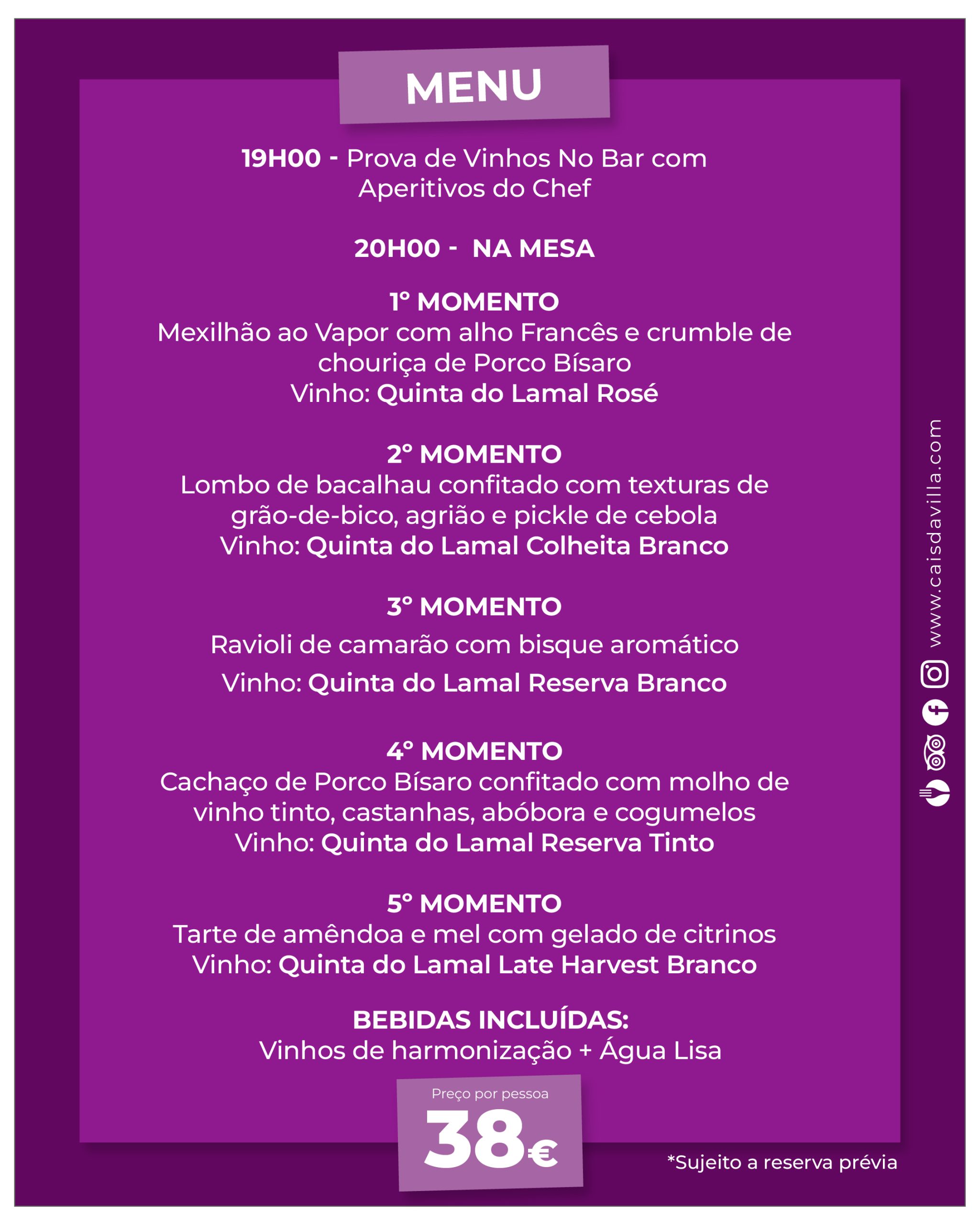 O Cais da Villa convida-o a viver uma experiência gastronómica exclusiva no Jantar Vínico Quinta do Lamal, numa noite dedicada aos Vinhos da Quinta do Lamal.