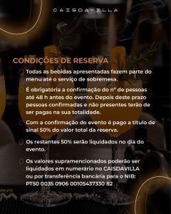 2. É obrigatória a confirmação do nº de pessoas até 48 h antes do evento. Depois deste prazo pessoas confirmadas e não presentes terão de ser pagas na sua totalidade.
