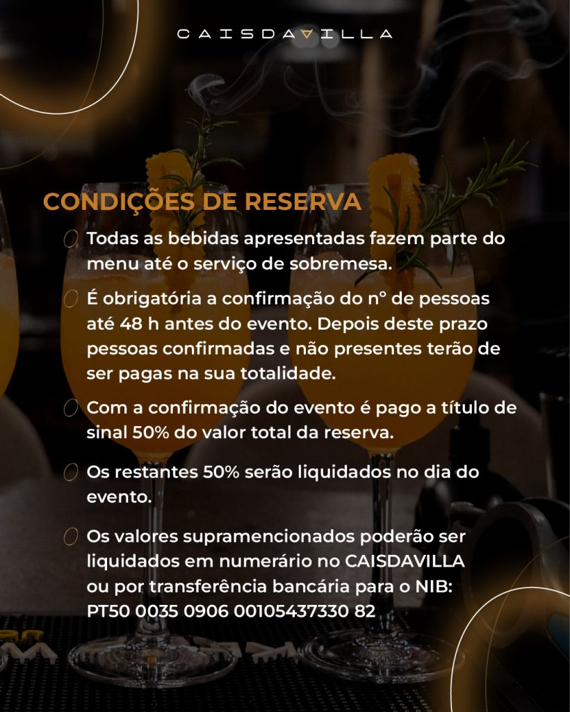 Preço por pessoa: 34 € (inclui 3 momentos de tapas + 3 cocktails de assinatura + musica ao Vivo)