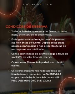 2.É obrigatória a confirmação do nº de pessoas até 48 h antes do evento. Depois deste prazo pessoas confirmadas e não presentes terão de ser pagas na sua totalidade.